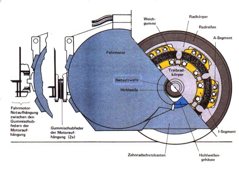den Lüftern gekühlt. Vom Motor gelangt der Strom über die Räder in die Schiene.