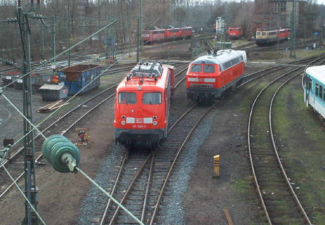 In Dessau wird immer noch über die evtl. Aufarbeitung oder Verschrottung der im September in Braunschweig Z-gestellten neun 110er entschieden ( 110-292,302,316,322,325,330,362,367). Kann man nur hoffen das zugunsten der Bügelfalten entschieden wird:-) ! Am 04.12.2001 spät nachmittag geriet zwischen Aßmannshausen und Lorch die 110 216-9 (Saarbrücken) vor einer RB in Brand. Irgendwie häufen sich die Brandschäden und Schaltwerksexplosionen. |